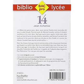 Un auteur majeur de la littérature contemporaine fait son entrée au Lycée avec Biblio ! Les cinq jeunes hommes que la guerre arrache à leur destin ne reviendront pas tous. Avec eux nous allons partager la lourdeur du sac (particulièrement lorsqu’il est mouillé), l’inconfort de l’uniforme, l’irruption de l’industrie dans la guerre. Pas d’héroïsme ? Si, mais pas celui que l’on attendait...Le texte intégral annotéUne interview exclusive de Jean Echenoz7 questionnaires d’analyse de l’œuvre conçus par une enseignante en lycée professionnel, en adéquation avec les programmes de français du baccalauréat professionnelUn dossier entièrement exploitable par l’élève