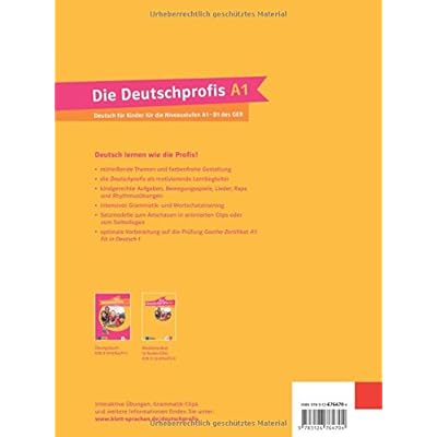 Deutsch lernen wie die Profis ! mitreissende Themen und farbenfrohe Gestaltung ; die Deutschprofis als motivierende Lernbegieiter ; kindgerechte Aufgaben, Bewegungsspiele, Lieder, Raps und Rhythmusübungen ; intensives Grammatik- und Wortschatztraining ; Satzmodelle zum Anschauen in animierten Clips oder zum Selbstlegen ; optimale Vorbereitung auf die Prüfung Goethe-Zertifikat A1 : Fit in Deutsch 1.