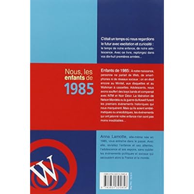 C'était un temps où nous regardions le futur avec excitation et curiosité : le temps de notre enfance, de notre adolescence. Avec ce livre, replongez dans vos dix-huit premières années... Nous, les enfants de 1985 Enfants de 1985 : À notre naissance, personne ne parlait de Web, de smartphones ni de réseaux sociaux : on en était encore au Minitel, aux disquettes et au Walkman à cassettes. Adolescents, nous avons souffert des boys bands et compensé avec NTM et Noir Désir. La libération de Nelson Mandela ou la guerre du Koweït furent les premiers événements historiques qui nous marquèrent. Mais qu'ils soient emblématiques ou anecdotiques, les événements qui ont jalonné notre enfance n'en sont pas moins inoubliables... Anne Lamotte, elle-même née en 1985, vous entraîne dans le passé. Avec elle, revisitez l'enfance et ses attentes, l'adolescence et ses espoirs, sans oublier les événements politiques et sociaux qui secouaient alors la France et le monde.